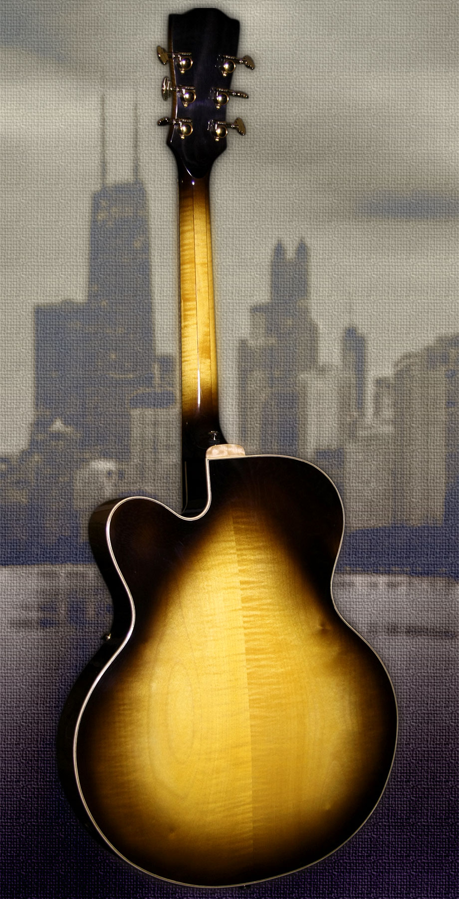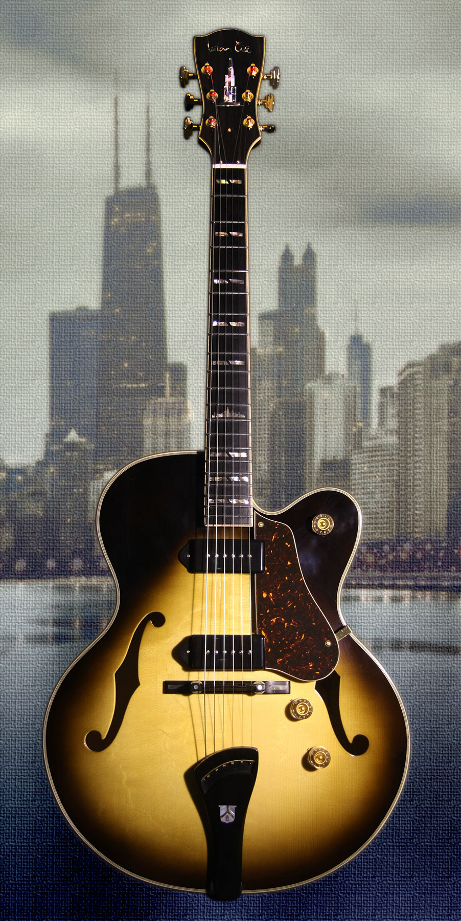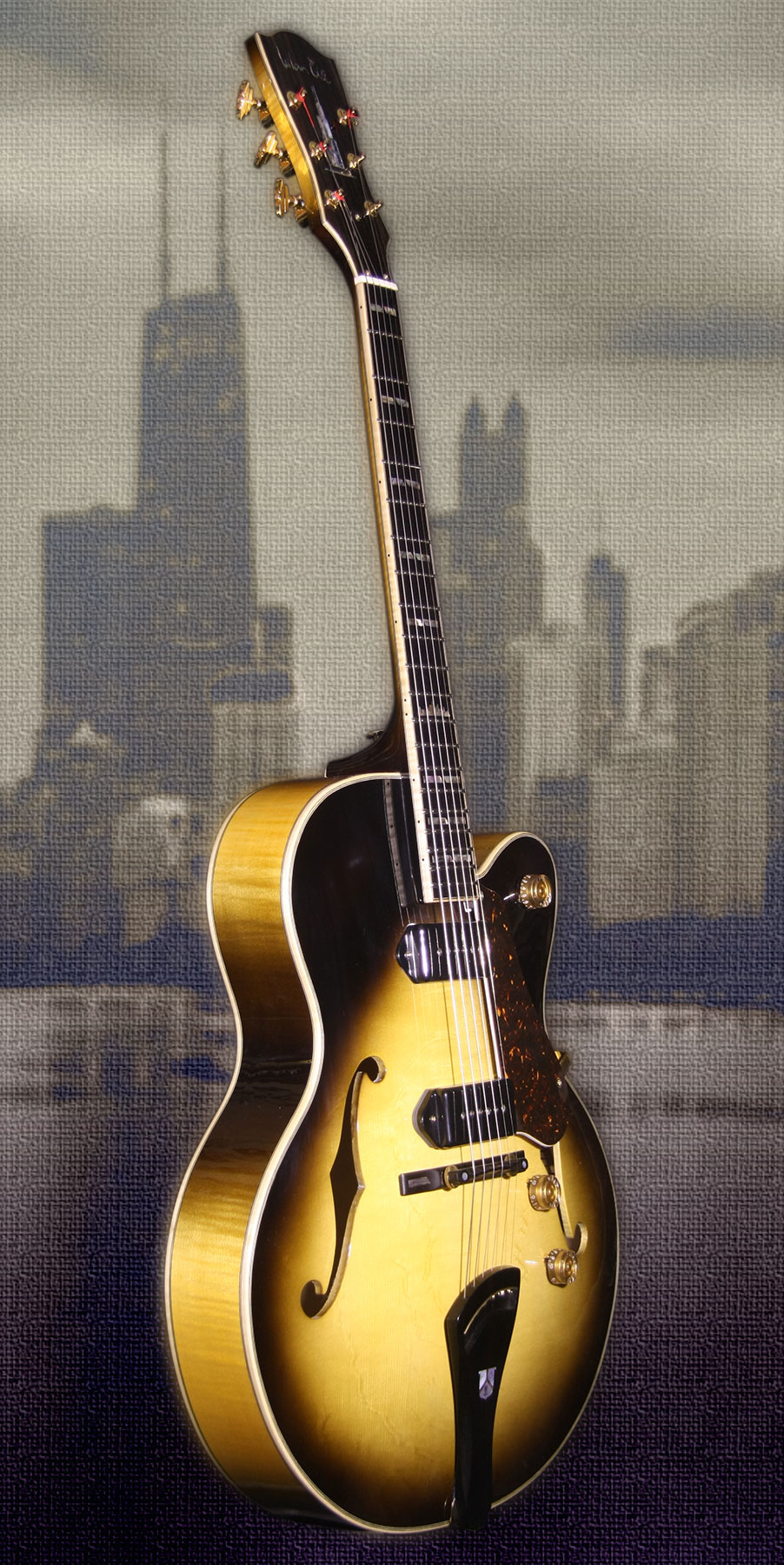 - Telo: Tradičná kombinácia dreva pre archtop gitary - smrek s javorom, F-otvormi a X rebrovaním. Obruby sú kombináciou vlnovitého javora a ebenu.