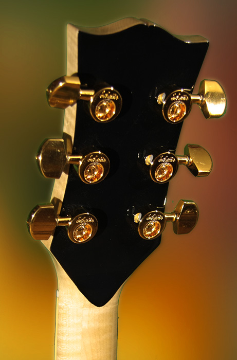 - Neck: 3 piece curly maple. Fingerboard is ebony with plastic binding and gold mother of pearl inlays. Peghead veneer is ebony on the front and ebony at the rear side. Neck meets the body at the 19th. fret. Neck profile is "soft D " with oil finish . A double way truss rod nut is under head veneer. Frets are "medium" size.