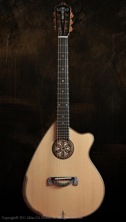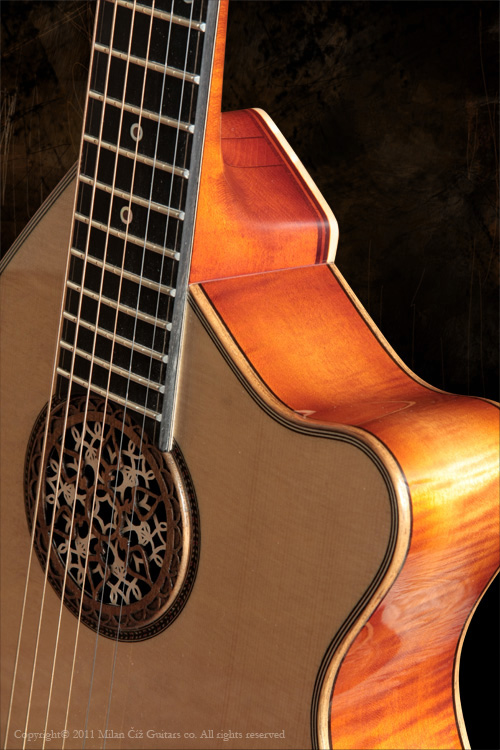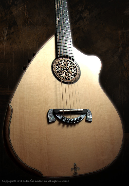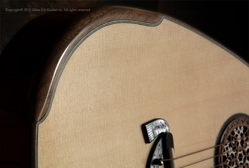 - Soundboard: Specially developed bracing for best result in non symetrical body. Fancy rossete is hand made from walnut and papyrus.