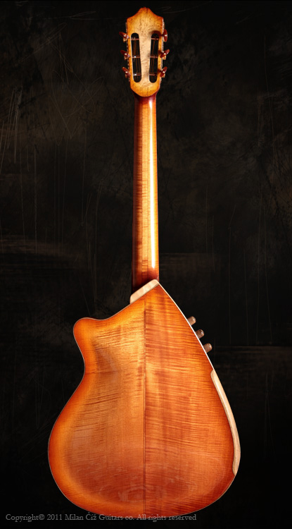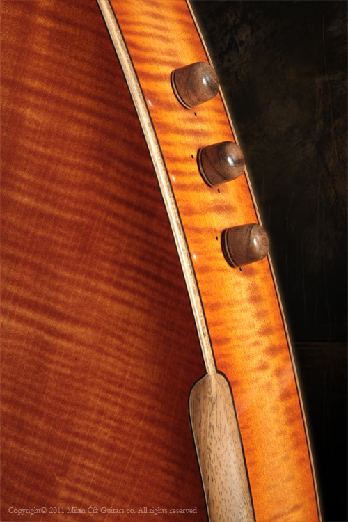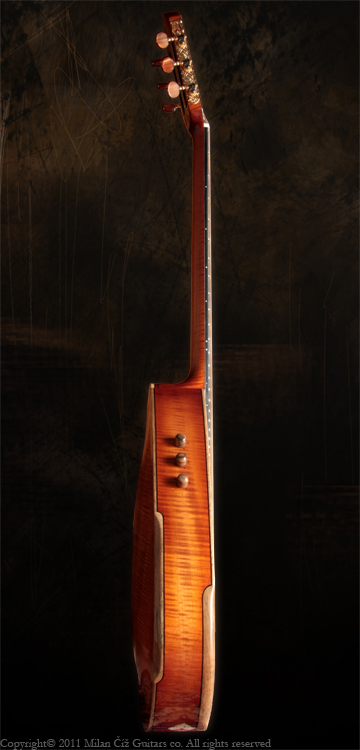 - Neck: 5 piece of curly maple and mahogany veneer. Fingerboard is ebony with ebony binding. Peghead veneer is ebony on the front and curly maple at the rear side. Neck meets the body at the 15th. fret. Neck profile is "soft C". A double way truss rod nut is under head veneer. Frets are "jumbo" size.